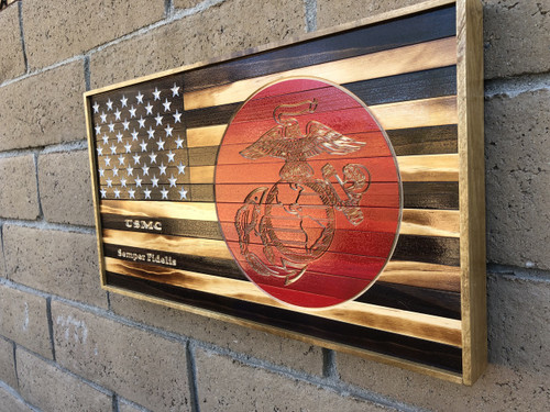 Traditional Wooden American Flag With Frame And Engraved Usmc Logo