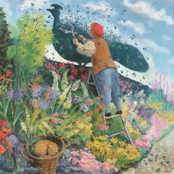 Trimming The Peacock Topiary Cat In Flower Garden Woman Etsy