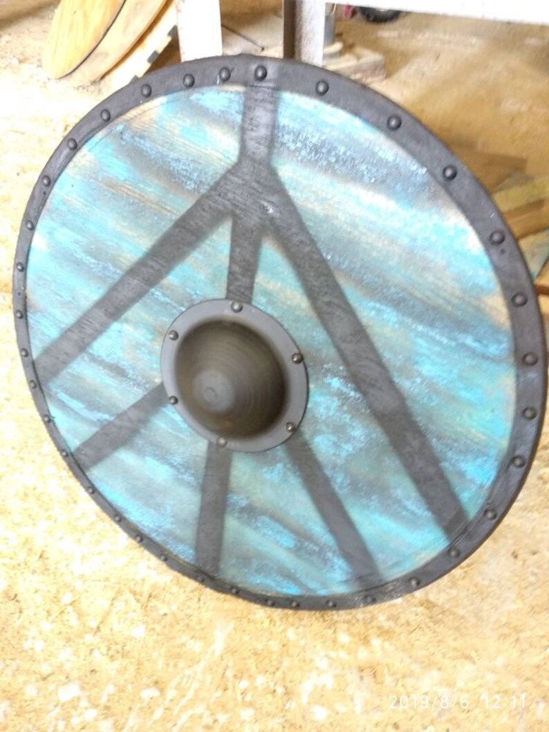 Functional larp viking battle shield shield diameter is about 2925 and it weights about 11 lbs. Draw around it and cut it out.